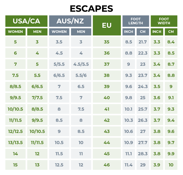 Escapes Size Guide